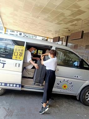 順慶分公司定制客運班長、駕駛員曾慧在抗疫轉(zhuǎn)運離港人員中,為旅客幫提行李箱。