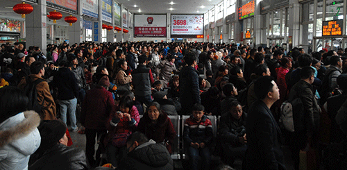中午1點多鐘,由于成南高速公路私家小車流量增大,嚴重堵車,造成加班車輛不能及時返回車站,致使到成都的旅客排著兩列隊伍從候車廳8號檢票口一直延伸到5號檢票口對面的候車廳內(nèi)。但一直沒有看見到成都排隊上車的隊伍延伸到候車廳外,象往年那樣在站前廣場蜿蜒曲折“山路十八彎”的情景了。懸掛著12個大紅燈籠的整個候車大廳里旅客十分擁擠,人滿為患,卻暖意融融。車站派出所所長楊宗明帶領(lǐng)6名公安干警和嘉陵區(qū)公安分局的8名特警來回巡邏執(zhí)勤,反恐防暴,高度警惕地維護著檢票上車和旅客候車秩序。