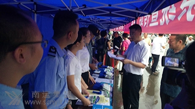 西充縣委常委、常務(wù)副縣長(zhǎng)龐亮(右二)到現(xiàn)場(chǎng)查看宣傳資料
